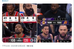 体育资讯12月24日讯 NBA常规赛,火箭108-128惨败快船,太阳132-108大胜湖人。